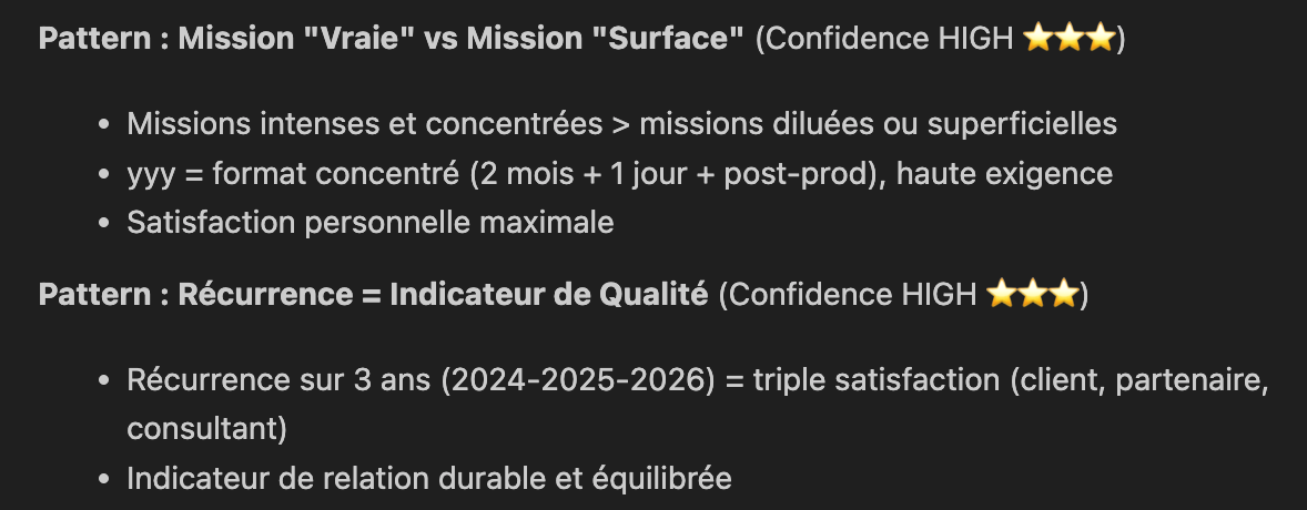 Depuis quelques semaines, j’utilise un système basé sur Claude pour m’aider à mener des introspection/conseils sur mes missions et formations. Je lui parle de ce que j’ai fait et comment ça s’est passé, il en tire des conclusions (learnings) et ensuite des patterns à reproduire (ou non).