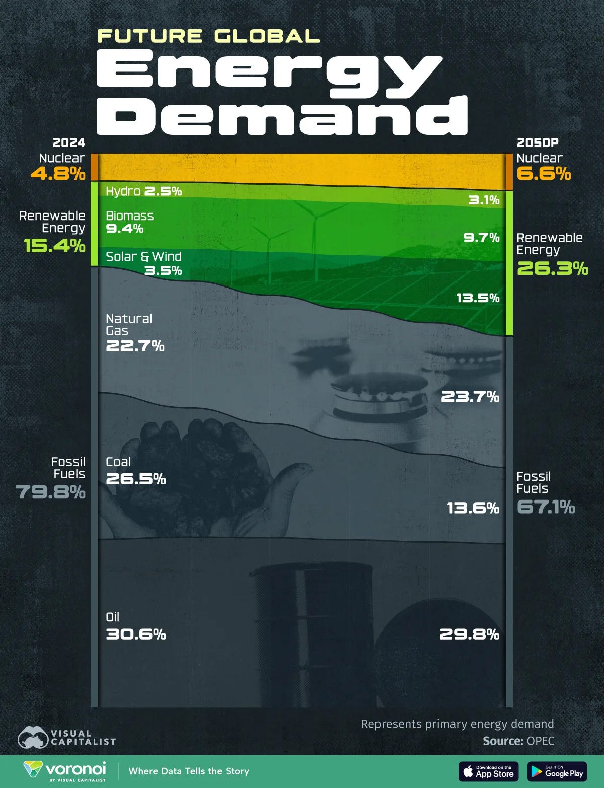 Le pétrole représentait 30,6% de la demande énergétique mondiale en 2024, et même si sa part devrait glisser à 29,8% en 2050, il restera le carburant dominant de la planète. Ah, la fameuse transition énergétique...