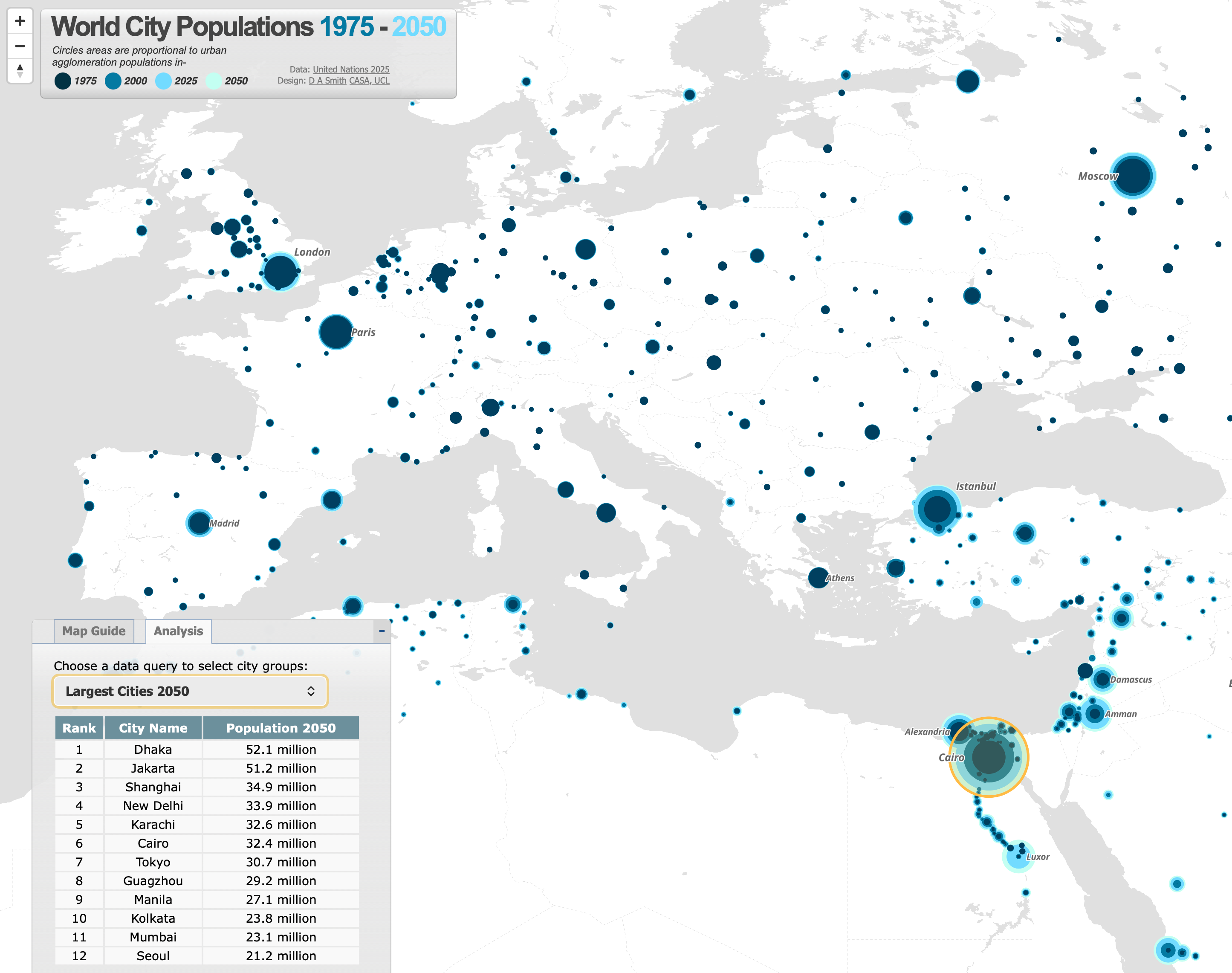 En survolant une ville, un mini graphique apparaît, affichant les tendances de croissance de la population ainsi que son classement national et mondial au fil du temps. En dézoomant, on peut voir à quel point la croissance démographique a été explosive dans les grappes de villes à travers l’Asie et l’Afrique.