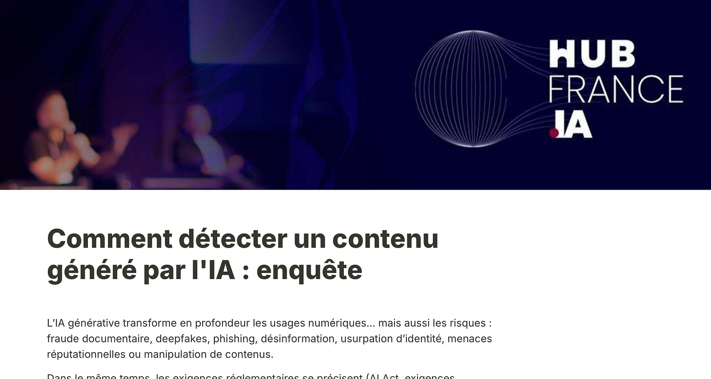 Deepfakes, voix clonées, documents falsifiés, images générées… On parle beaucoup de créer avec l’IA. Mais on parle moins de détecter ce qu’elle crée. Et c’est un sujet qui me turlupine (un ami disait très poliment : “turlupréoccupe” — quel farceur ; et je mets cette petite digression ici pour troubler vos détecteurs d’IA : le “turlupréoccupe” n’est carrément pas IA, pas plus que le ‘;’ mais le ‘—”, celui-là je l’adore et ne me prive pas d’en mettre partout… so IA).