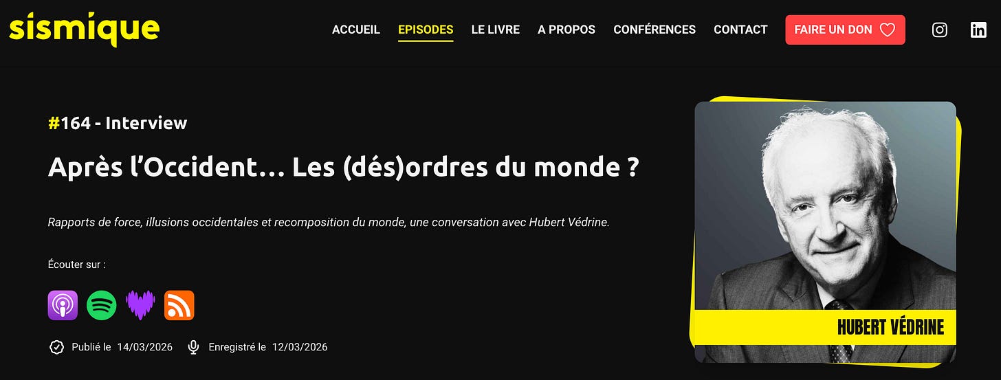 Il a interviewé un homme qui m’impressionne : Hubert Védrine (j’ai adoré son Dictionnaire amoureux de géopolitique). Deux épisodes de géopo qui passent en revue notre monde et celui qui se façonne pour demain. D’une grande intelligence à mon sens.